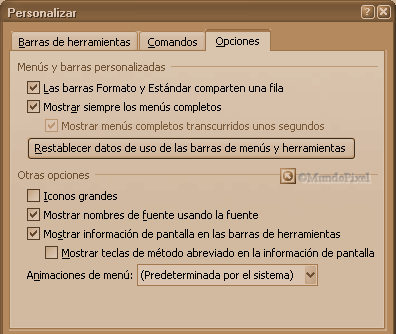1 .En el menú Herramientas , haga clic en Personalizar y, a continuación, haga clic en la ficha Opciones . |