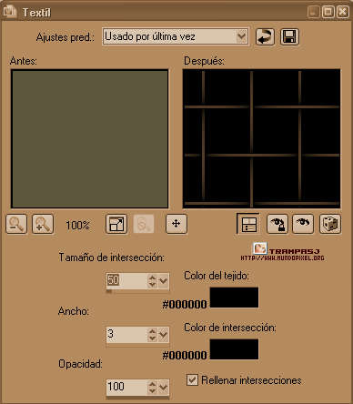 Abrimos una imagen transparente de 550x350 píxeles. Color de Primer Plano #5E573D. Efectos / Efectos de Textura / Textil. (Ver capturas).