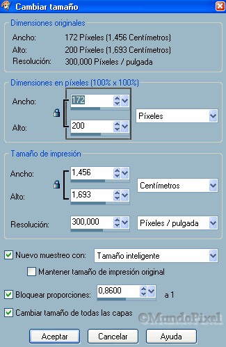 Pasamos al siguiente paso, una vez teniendo este dato, vamos a REDIMENSIONAR IMAGEN/CAMBIAR TAMAÑO: Aparece el cuadro de diálogo CAMBIAR TAMAÑO. Elige el botón DIMENSIONES EN PIXELES para introducir en las casillas los valores de Ancho y Alto. Advierte que si la casilla BLOQUEAR PROPORCIONES ... está activada, al modificar la anchura se adapta automáticamente la altura para conservar las proporciones. De esta forma la imagen no se deforma.